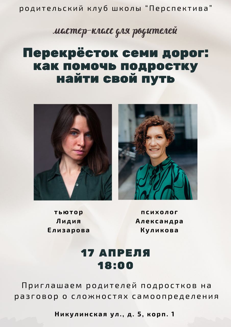Родительский клуб школы «Перспектива» приглашает на мастер-класс «Перекрёсток семи дорог: как помочь подростку найти свой путь».
