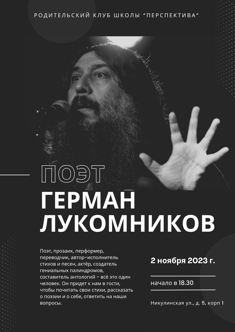Друзья, нас ждет еще одно потрясающее событие — встреча с Германом Лукомниковым в родительском клубе школы «Перспектива». Герман — поэт и прозаик, перформер и актер, автор-исполнитель стихов и песен и составитель антологий. Многие знают его как автора гениальных палиндромов, а его стихи переведены на 14 языков.
